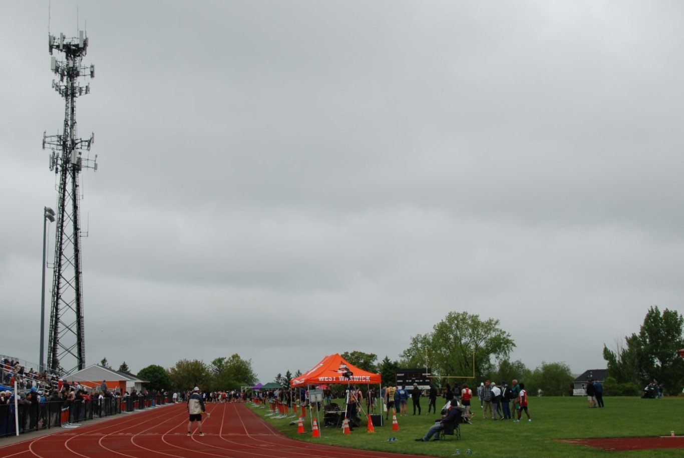 Photo: West Warwick High School Track with cell tower. The FCC allows the dangerous proximity of radiofrequency/microwave radiation pollution to spectators, atheletes , coaches, students and staff.
